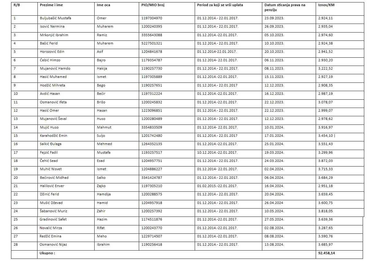 Korisniku sredstava privrednom društvu KRIVAJA MOBEL d.o.o. Zavidovići - u stečaju, Ul. Radnička bb, Zavidovići, JIB 4218863270006, odobrava se dodjela dijela sredstava iz tačke I. ove odluke u ukupnom iznosu od 92.458,14 KM za uplatu doprinosa za PIO/MIO za 28 radnika, kako slijedi: