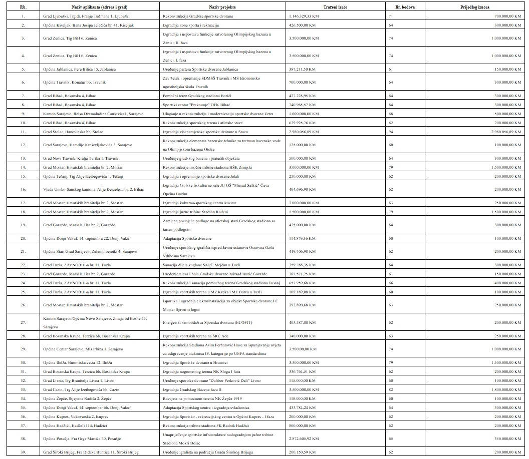 Na osnovu kriterija iz tačke IV., a u vezi sa tačkama VI. i VII. Odluke, a na prijedlog Komisije za dodjelu dijela sredstava kantonima, gradovima i općinama iz Budžeta Federacije Bosne i Hercegovine za izgradnju, adaptaciju i rekonstrukciju sportske infrastrukture, utvrđuje se raspodjela sredstava u iznosu od 19.980.056,89 KM na gradove i općine sa pojedinačnim i konačnim iznosima kako je prikazano u tabelarnom pregledu: