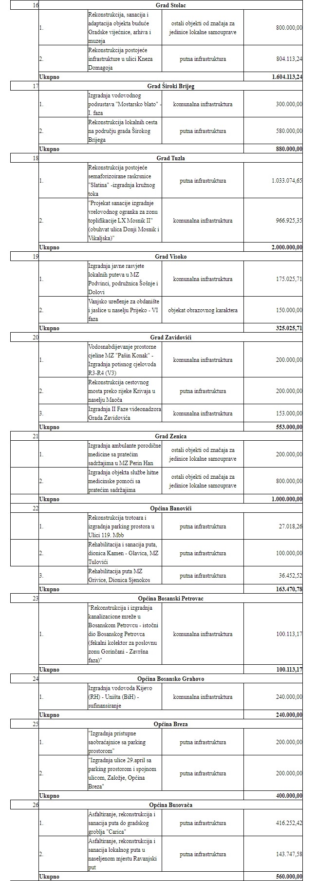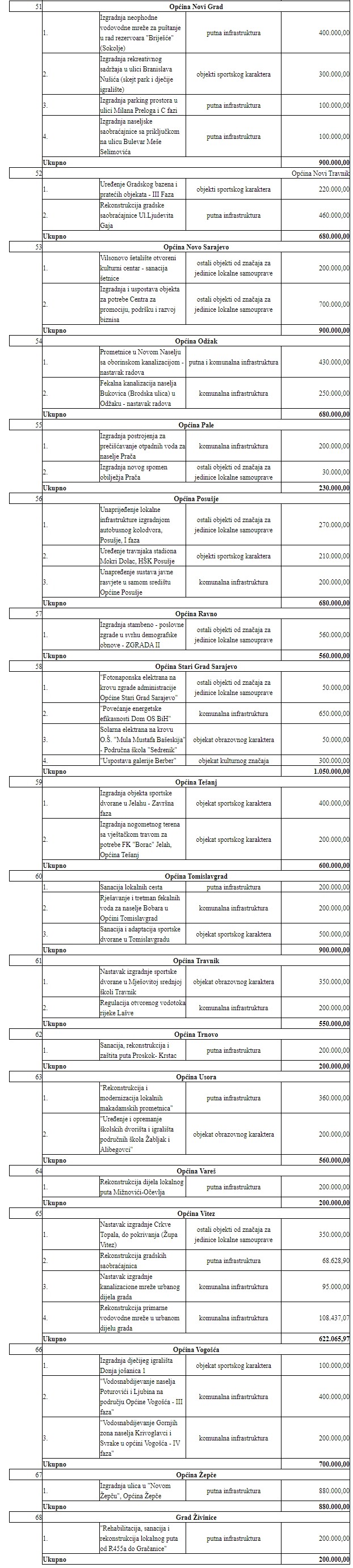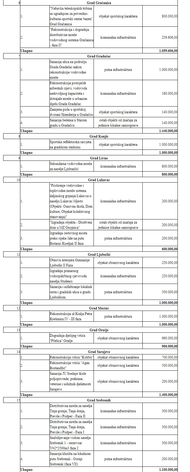 Na osnovu kriterija iz tačke IV., a u vezi tačke V. Odluke, a na prijedlog Komisije za dodjelu sredstava općinama i gradovima iz Budžeta Federacije Bosne i Hercegovine, utvrđuje se raspodjela sredstava u iznosu od 49.995.471,18 KM na općine i gradove s pojedinačnim i konačnim iznosima kako je prikazano u tabelarnom pregledu: