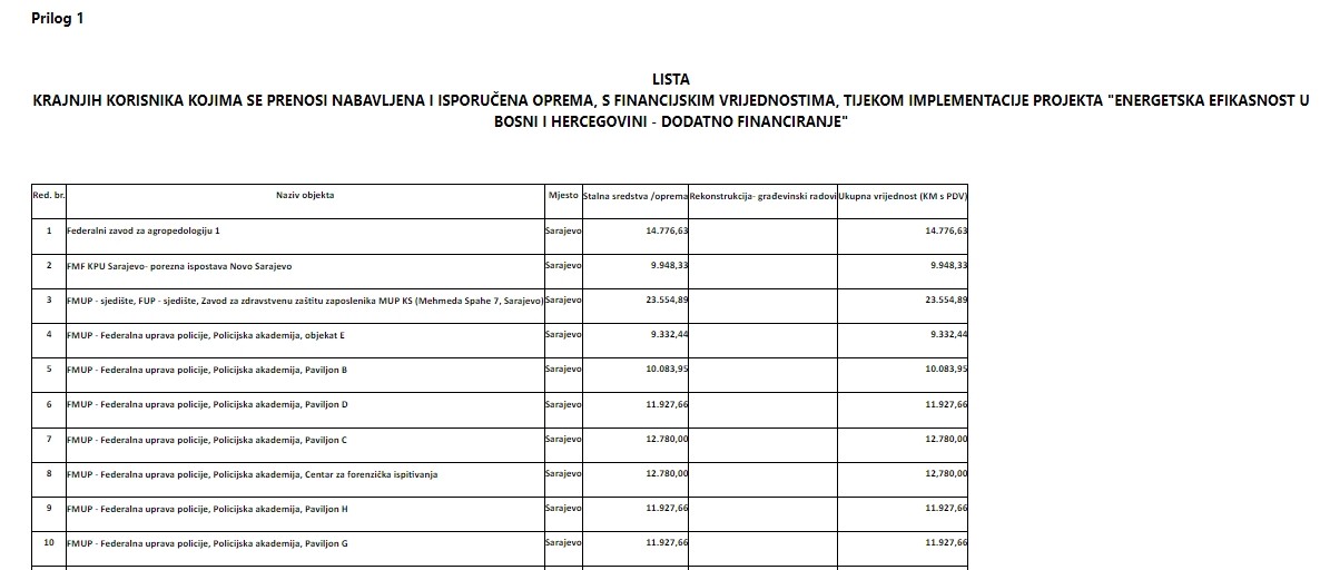 O PRIJENOSU NABAVLJENIH STALNIH SREDSTAVA U OKVIRU PROJEKTA "ENERGETSKA EFIKASNOST U BOSNI I HERCEGOVINI - DODATNO FINANCIRANJE", KRAJNJIM KORISNICIMA