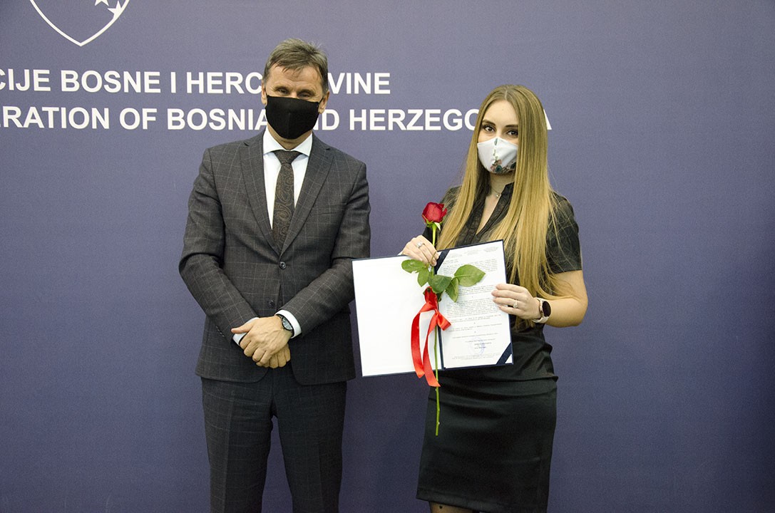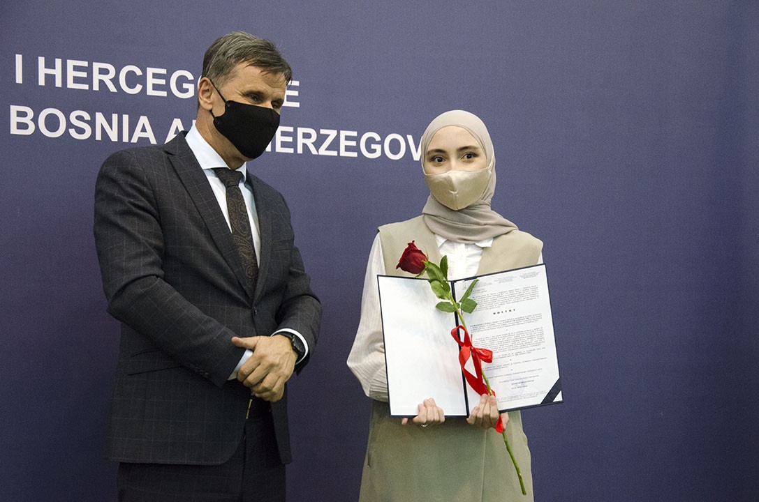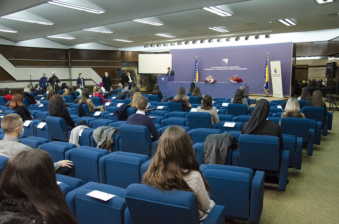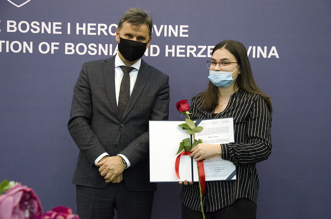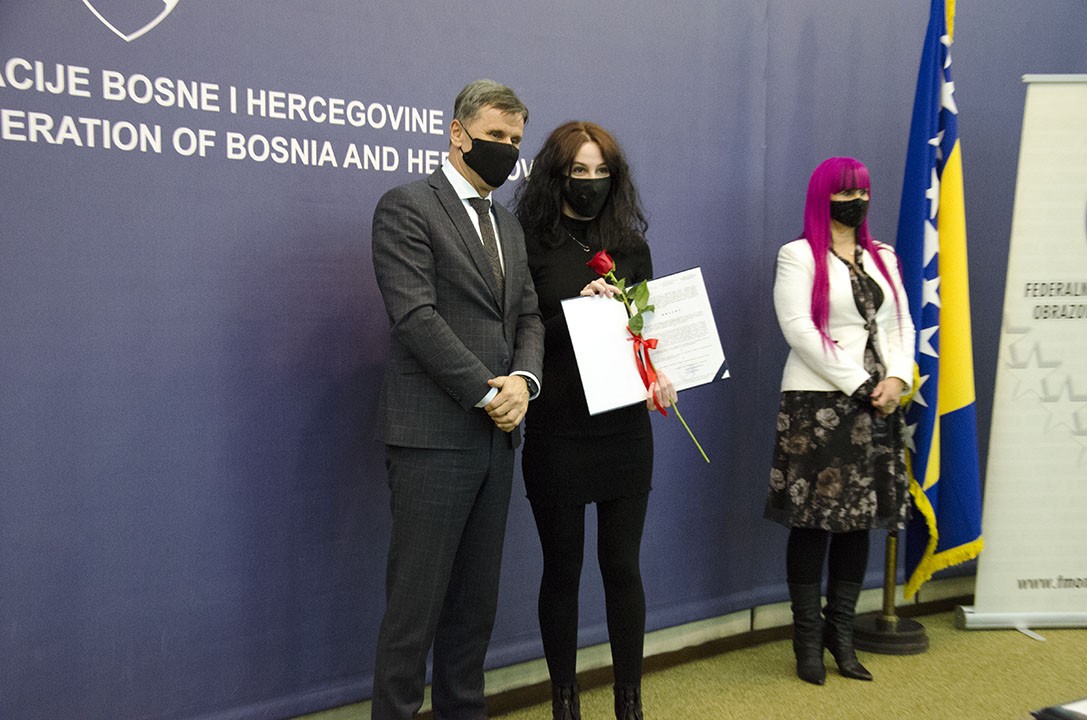 U organizaciji Federalnog ministarstva obrazovanja i nauke/znanosti, u sjedištu Vlade Federacije BiH u Sarajevu, danas je upriličena svečana dodjela priznanja i novčanih nagrada najboljim studentima u Federaciji BiH u akademskoj 2020/2021. godini.