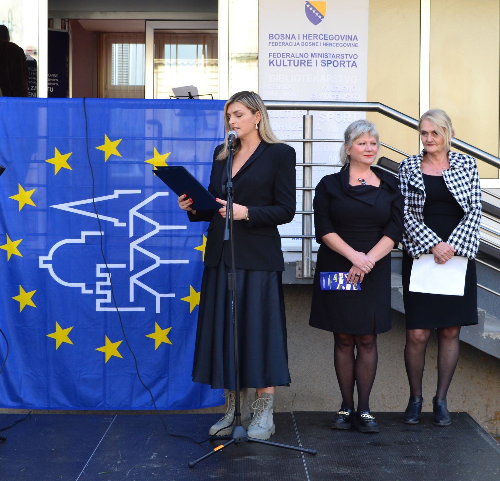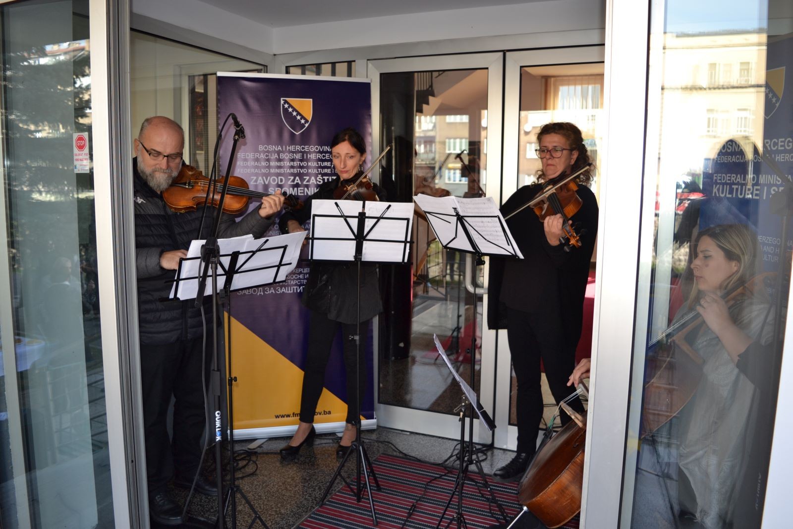 Удружење грађана Обојена клапа из Сарајева данас је почело реализирати програм „Жива баштина и пејзажна архитектура те израду мурала на фасади приземља зграде Министарства, а финални продукт бит ће видљив у наредном периоду. Ускоро ће бити организирана и панел дискусија о теми „Стреет арт, зидно сликарство или отпор нормама”, а посебан акцент ће бити стављен на заштиту националних споменика, о чему ћемо обавијестити јавност. За музички дио данашњег програма био је задужен Квартет Севдах те ученици Средње музичке школе из Сарајева на челу с професорицом дириговања Тамаром Вигњевић, Елмедина Аличић и Хусеин Бајрактаревић, млади хармоникаш који је као представник Босне и Херцеговине у конкуренцији јуниора освојио треће мјесто у категорији класична хармоника на Свјетском купу у Швицарској, саопћено је из Федералног министарства културе и спорта.