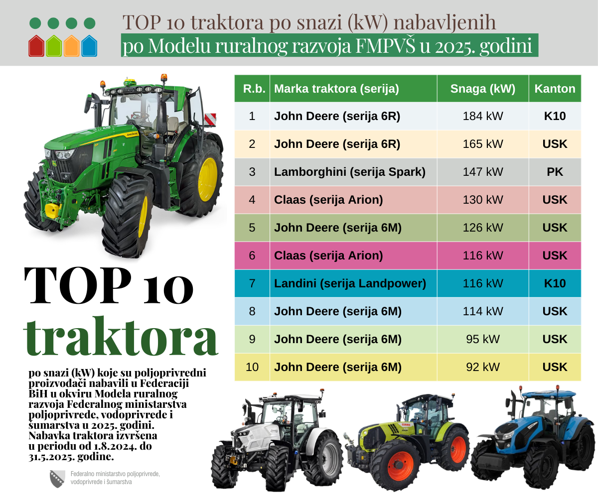 - Пољопривредници су током 2025. године најчешће бирали приступачне и функционалне тракторе марки Тафе, Деутз-Фар, Yto, Антонио Караро, Еуровол, Ловол, Арматрак, Тавол, Зетор Башак, чиме је омогућена поуздана и економична механизација за свакодневни рад у пољопривреди. Када је ријеч о снази трактора, израженој у kW, највећи број трактора велике снаге набавили су пољопривредни произвођача с подручја Унско-санског кантона, чак седам. У категорији трактора с највише kW доминирају свјетски познати произвођачи као што су Џон Деере, Ламборђини, Клаас и Ландини. Трактори веће снаге омогућавају ефикаснији рад на већим површинама и у захтјевнијим условима производње – наводе из Министарства.