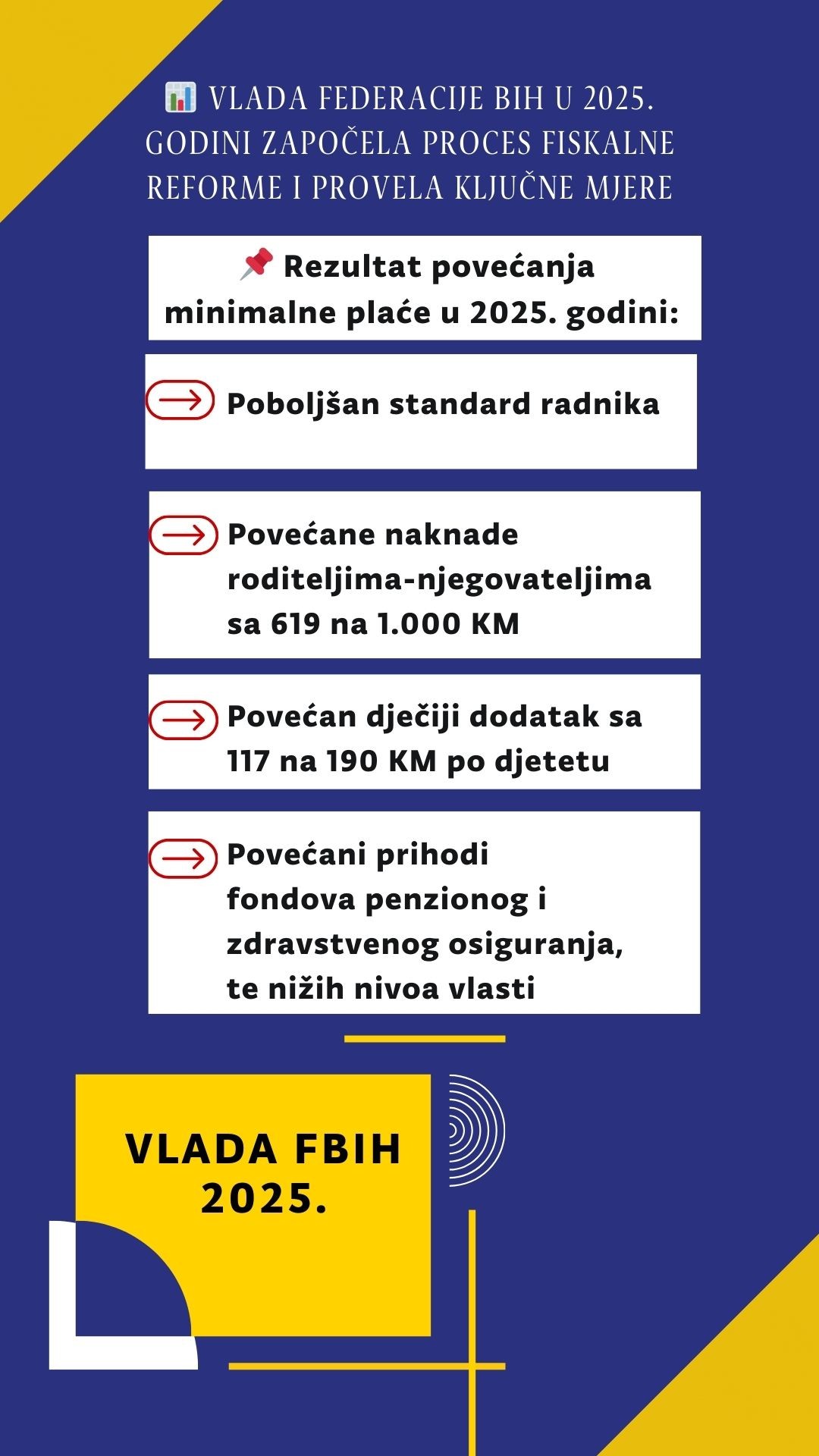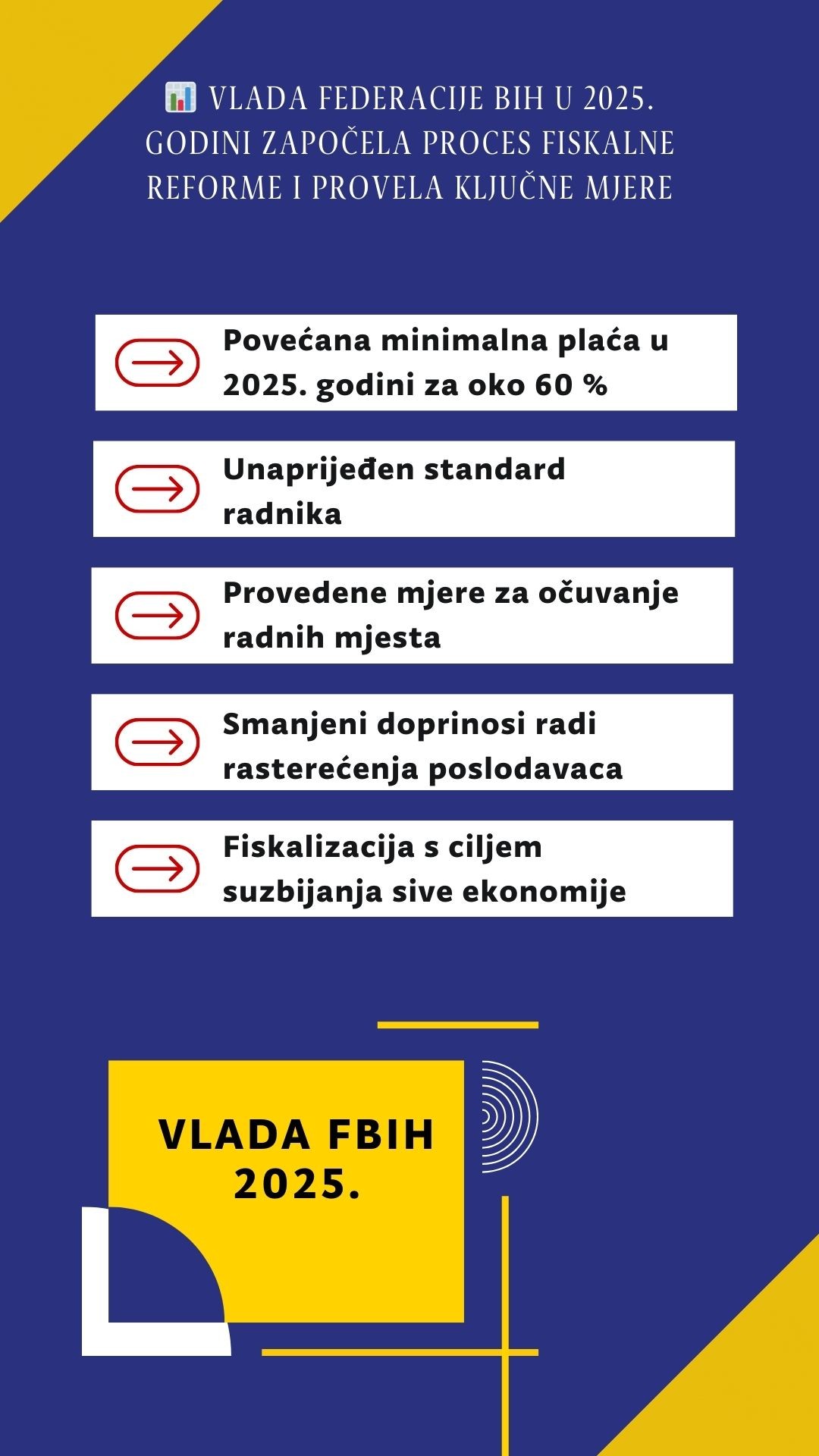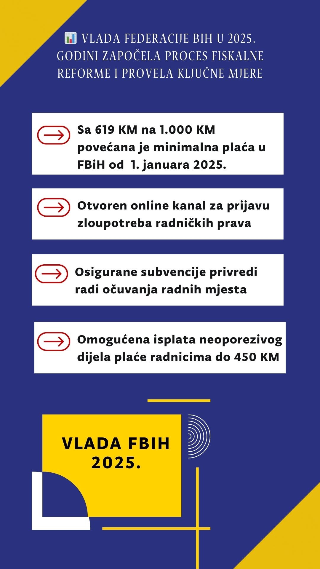 Влада Федерације Босне и Херцеговине у 2025. години наставила је проводити свеобухватне мјере на јачању економског и социјалног положаја грађана, унапређењу стандарда радника, очувању радних мјеста, растерећењу послодаваца и сузбијању сиве економије.