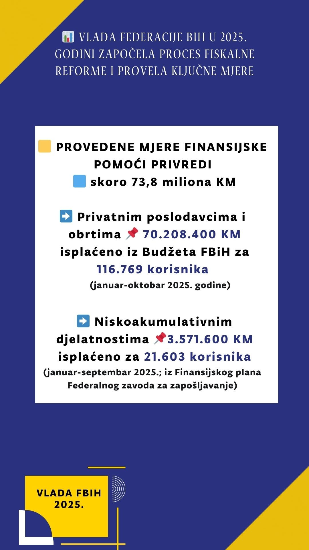Паралелно са повећањем минималне плате, Влада Федерације БиХ је, са циљем очувања запослености и стабилности пословања, провела мјере финансијске подршке приватним послодавцима, обртима и осталим самосталним дјелатностима, као и нискоакумулативним дјелатностима. Укупни износ финансијске подршке привреди достигао је износ од 73.780.000 КМ. За првих девет мјесеци 2025. године приватним послодавцима и обртима из Буџета ФБиХ издвојено је 70.208.400 КМ за укупно 116.769 корисника, док је закључно са септембром осигурано додатних 3.174.900 КМ за 21.603 корисника из нискоакумулативних дјелатности.