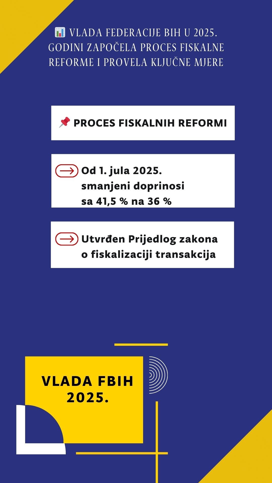 У оквиру фискалних реформи, од 1. јула 2025. године започела је примјена измјена Закона о доприносима, којима је укупна збирна стопа доприноса у Федерацији БиХ смањена са 41,5 посто на 36 посто, чиме је додатно растерећена привреда и створен повољнији амбијент за очување постојећих и отварање нових радних мјеста. Такође, Влада Федерације БиХ је утврдила и у парламентарну процедуру упутила Приједлог закона о фискализацији трансакција, чији је циљ сузбијање сиве економије.