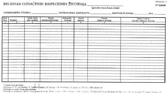 podrucja na propisanim obrascima "Registar oznacenih rasplodnih zivotinja"