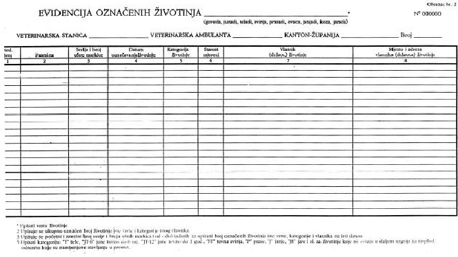 i propisani obrasci dokumentacije o obaveznom oznacavanju zivotinja: "Registar